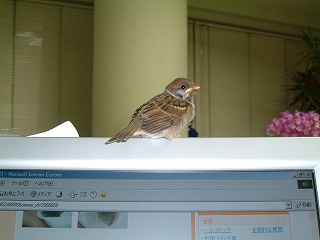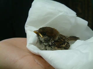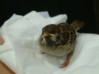 | 5月23日(火) 花屋さんに迷い込んだ子スズメで、巣からはぐれたようです。 まだ、飛べないので、しばらくうちで面倒見て、2週間くらいして飛べるようになったら放します。 でも、親の元で育ちすぎてるので、私から餌を積極的に食べません。 育つかどうか微妙です。 ![]() ![]() |